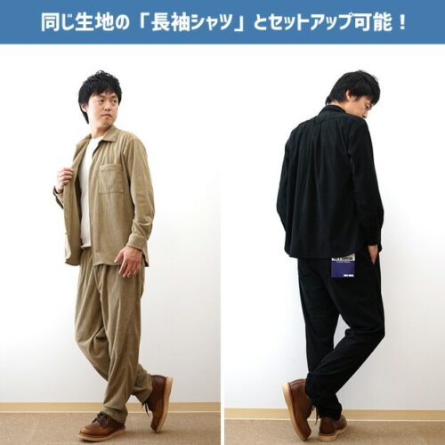 シンプルなデザインが魅力で、カジュアルからきれいめまで幅広いスタイルに合わせやすく、同じ生地の「長袖シャツ」と組み合わせることで、洗練された大人のセットアップコーデを完成させることができます。